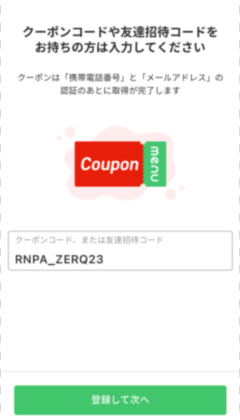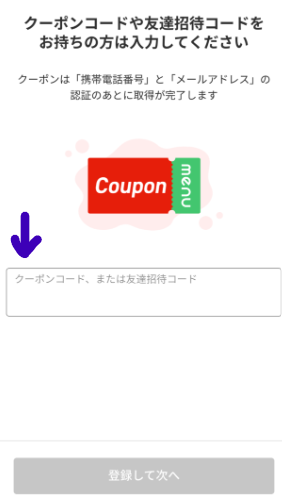 クーポンコードを入れる画面で初回限定クーポンのコードを入力します。