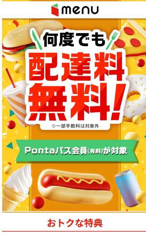 Pontaパスに会員登録するとmenuのデリバリー配達料が何度でも無料になります。