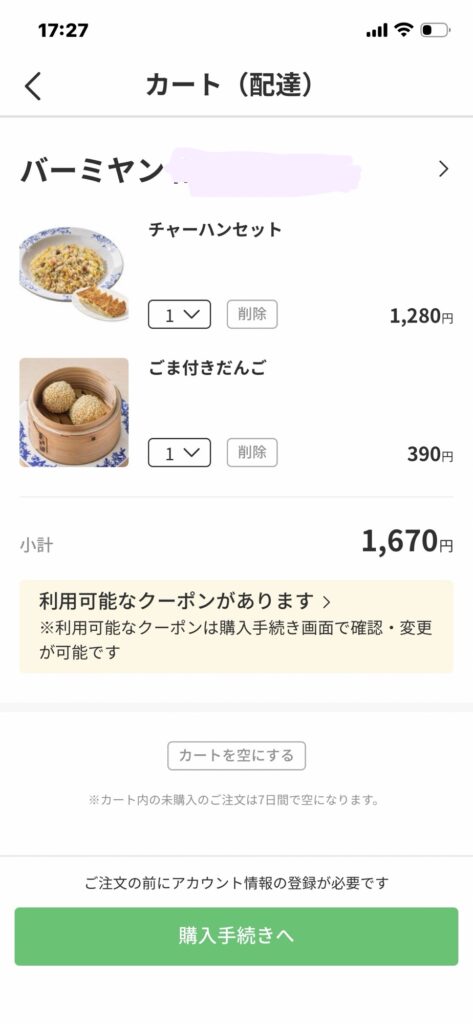 チャーハンセット1,280円に、デザートのごま付きだんご390円もカートにいれて合計1670円を注文します。
