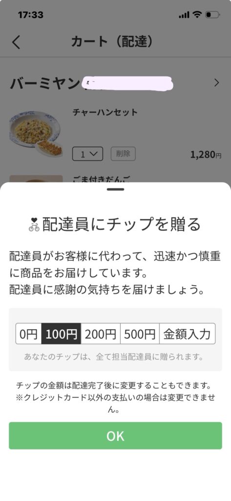 menuの配達料
