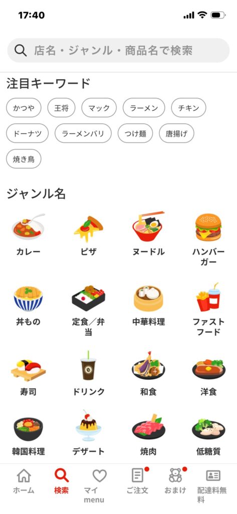 私の地域では、それぞれのジャンルには10~80件ほどの店舗が掲載されていて、店舗をクリックすると多くのメニューから選ぶことができます。