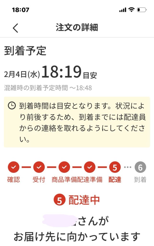 注文すると、到着時刻が表示されます。