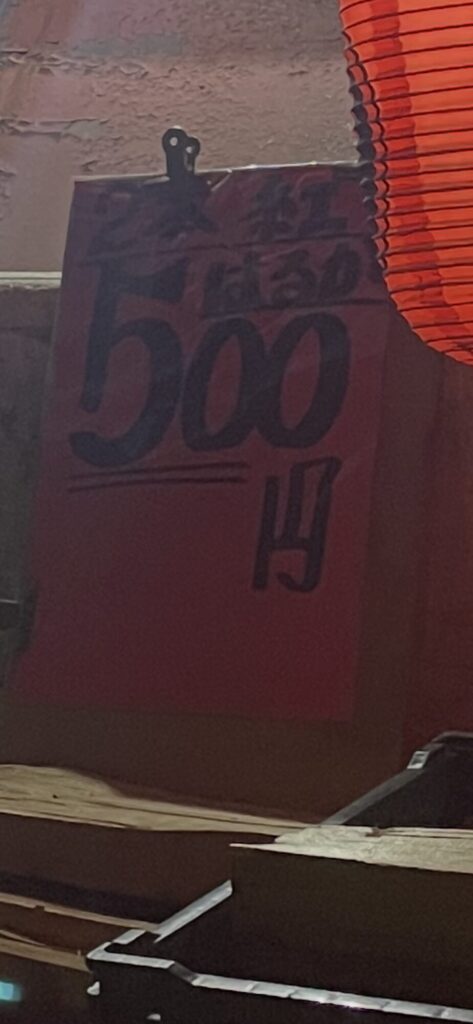 段ボールの紙にマジックで書かれた焼き芋のお値段は2本で500円